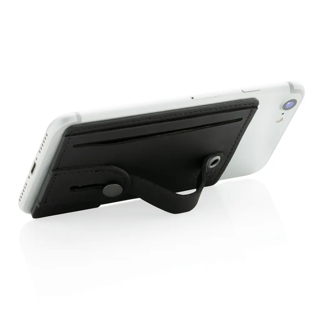 PU-materiaal RFID safe kaarthouder die ook als telefoonhouder en standaard kan worden gebruikt. Deze RFID-kaarthouder kan maximaal 2 bankpassen of ID-kaarten bevatten en beschermt ze tegen ongeoorloofde scans en frauduleuze activiteiten. Met de tape op de achterkant kunt u de kaarthouder op uw mobiel bevestigen. Het item heeft een riem die zowel als houder als als standaard kan worden gebruikt.””