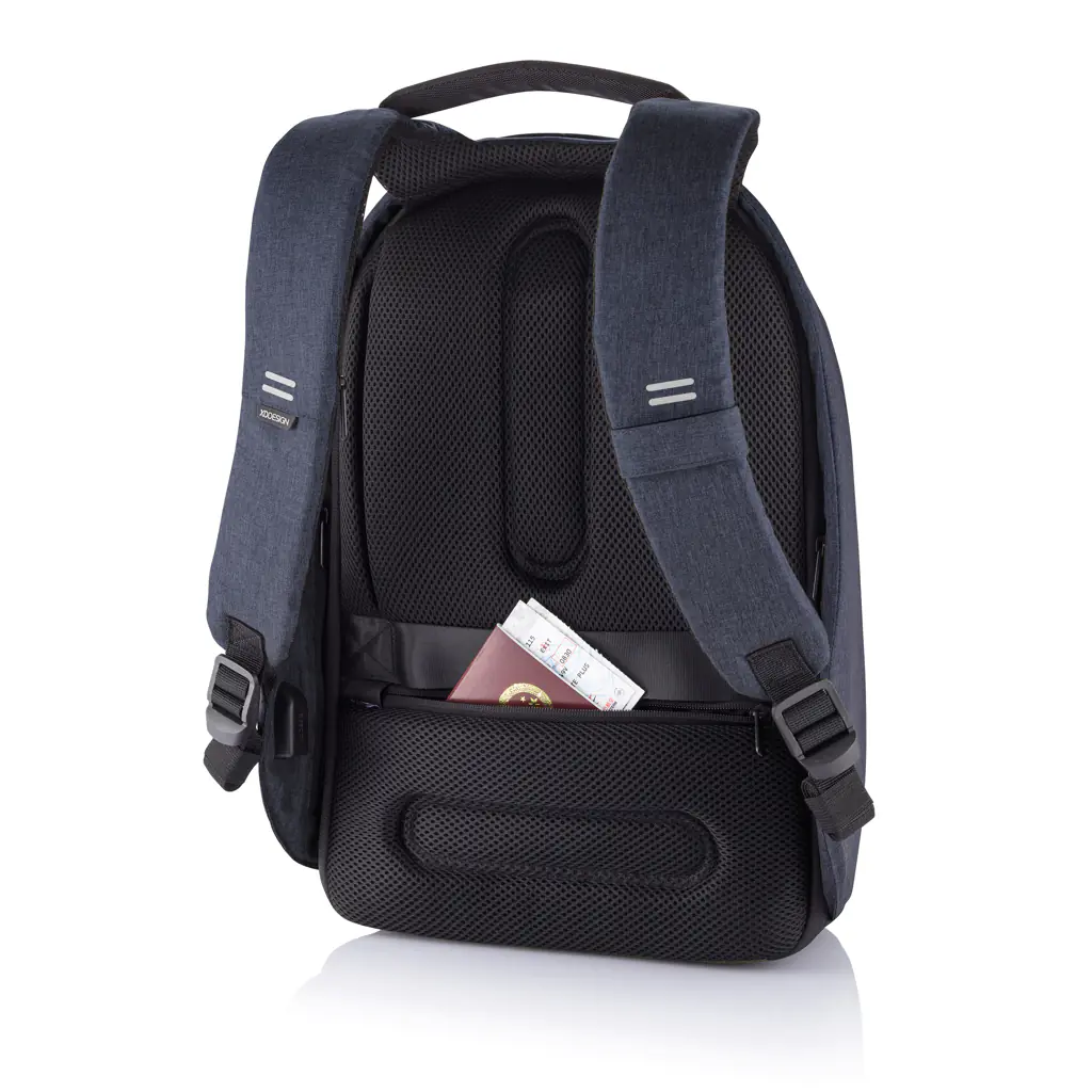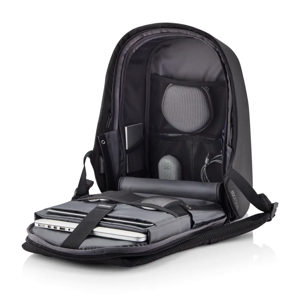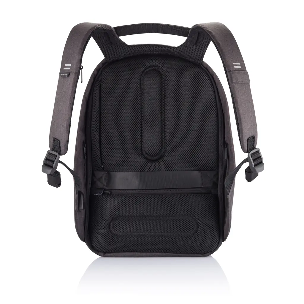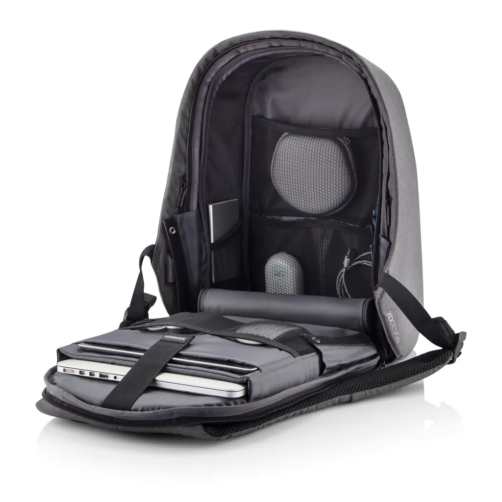 De Bobby Hero lijn is onze nieuwe generatie anti-diefstal rugzakken. Dit nieuwe model helpt u om altijd veilig, zorgeloos en georganiseerd te reizen. Het snijvaste en waterafstotende materiaal waar de tas van gemaakt is en de verborgen ritssluitingen & zakken houden uw spullen veilig terwijl u onderweg bent. Bobby Hero is ook een heel handige rugzak met functies zoals een ge ntegreerde USB-laadpoort, oplichtende veiligheidsstrips en een bagageband. Aan de binnenkant zitten gewatteerde compartimenten voor een 17″ laptop, tablet tot 12,9″ en al uw andere spullen. De rugzak is gemaakt van 35 rPET (gerecyclede PET-flessen). Geregistreerd ontwerp “”