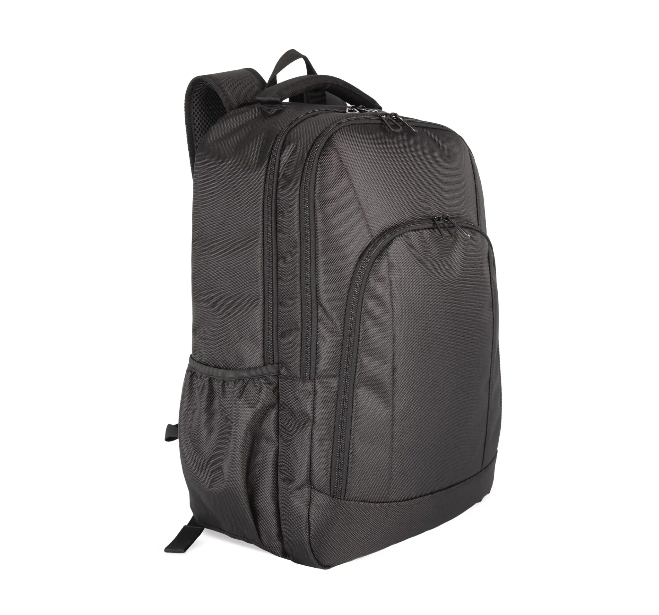 100% polyester. Businessrugzak met een groot documentenvak in het midden, verschillende opbergzakjes en een grote ritszak in de voering. In het gewatteerde vak achteraan past een laptop. Frontpaneel met ritszak voor eenvoudige personalisatie. Meshzakken aan de zijkant. Ergonomische schouderbanden en ademende achterkant met riem om de tas te bevestigen aan een trolley, voor eenvoudig transport.