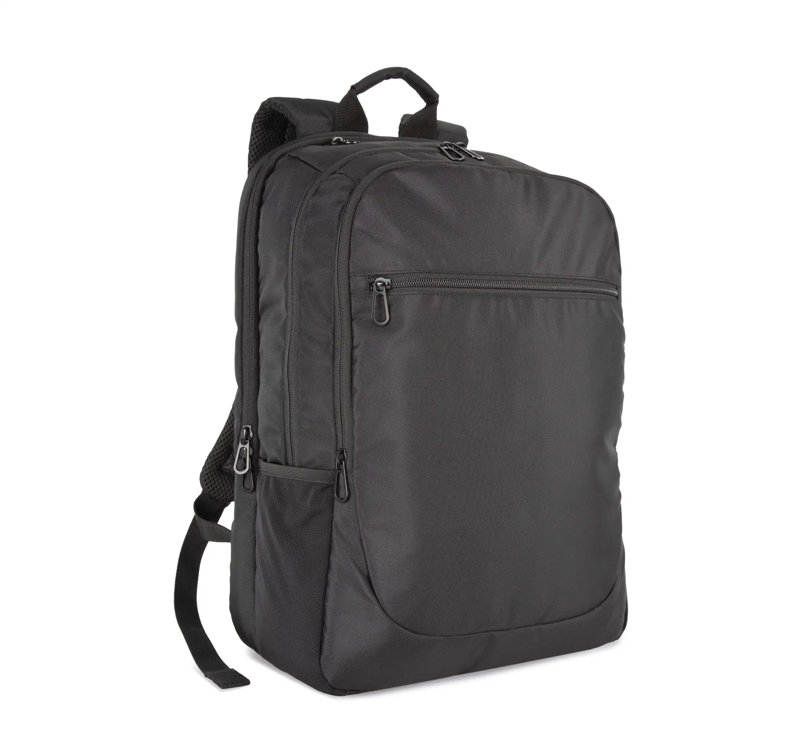 100% polyester. Businessrugzak met een groot documentenvak in het midden, verschillende opbergzakjes en een grote ritszak in de voering. In het gewatteerde vak achteraan past een laptop. Frontpaneel met ritszak voor eenvoudige personalisatie. Meshzakken aan de zijkant. Ergonomische schouderbanden en ademende achterkant met riem om de tas te bevestigen aan een trolley, voor eenvoudig transport.