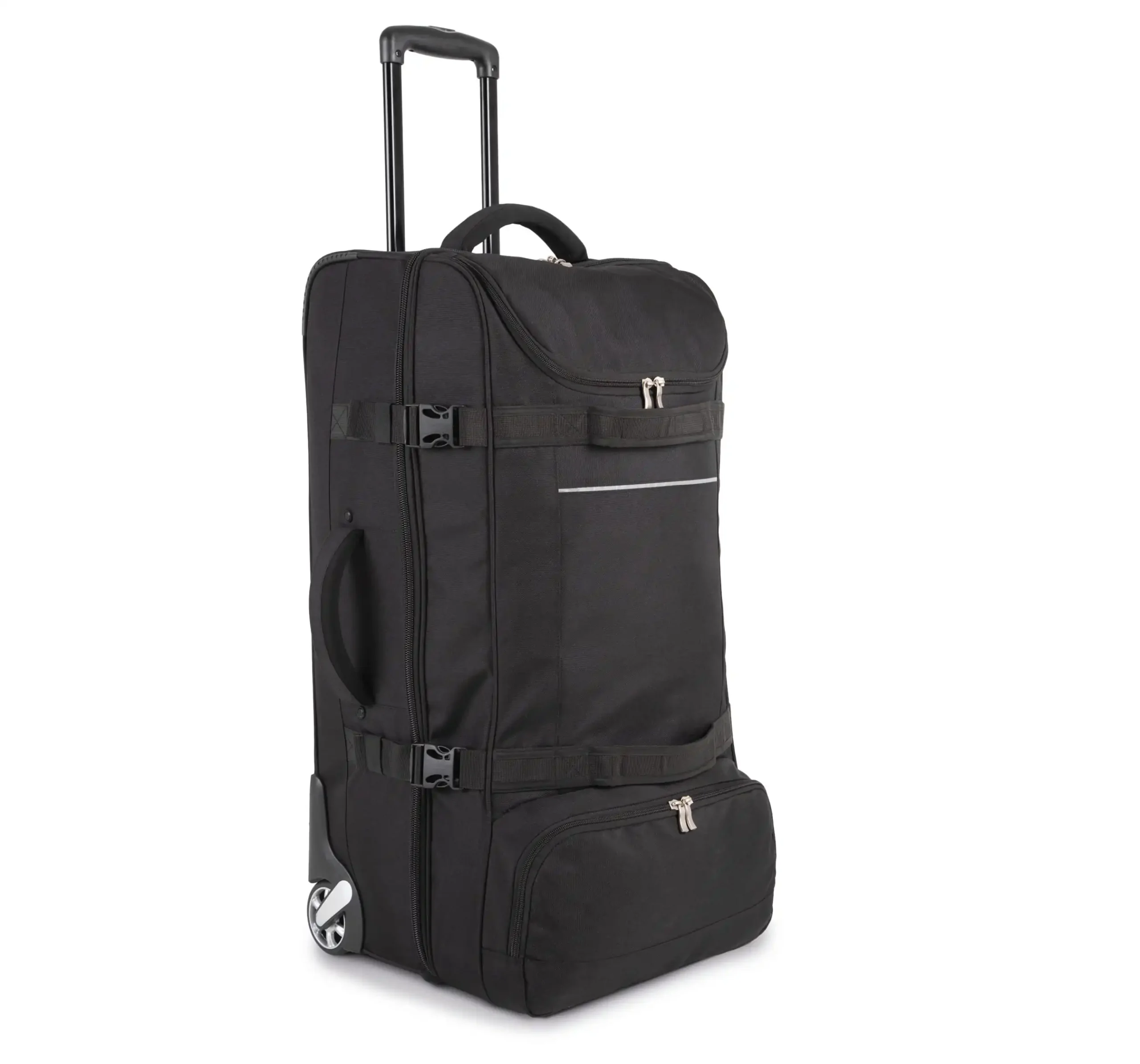 Speciale business trolleykoffer met de juiste handbagageafmetingen. Trolleysysteem in elegant gebogen aluminium. Voorvak dat dienst doet als aktetas. Gevoerd laptopvak. Groot kledingvak. 100 % personaliseerbaar voorvak.