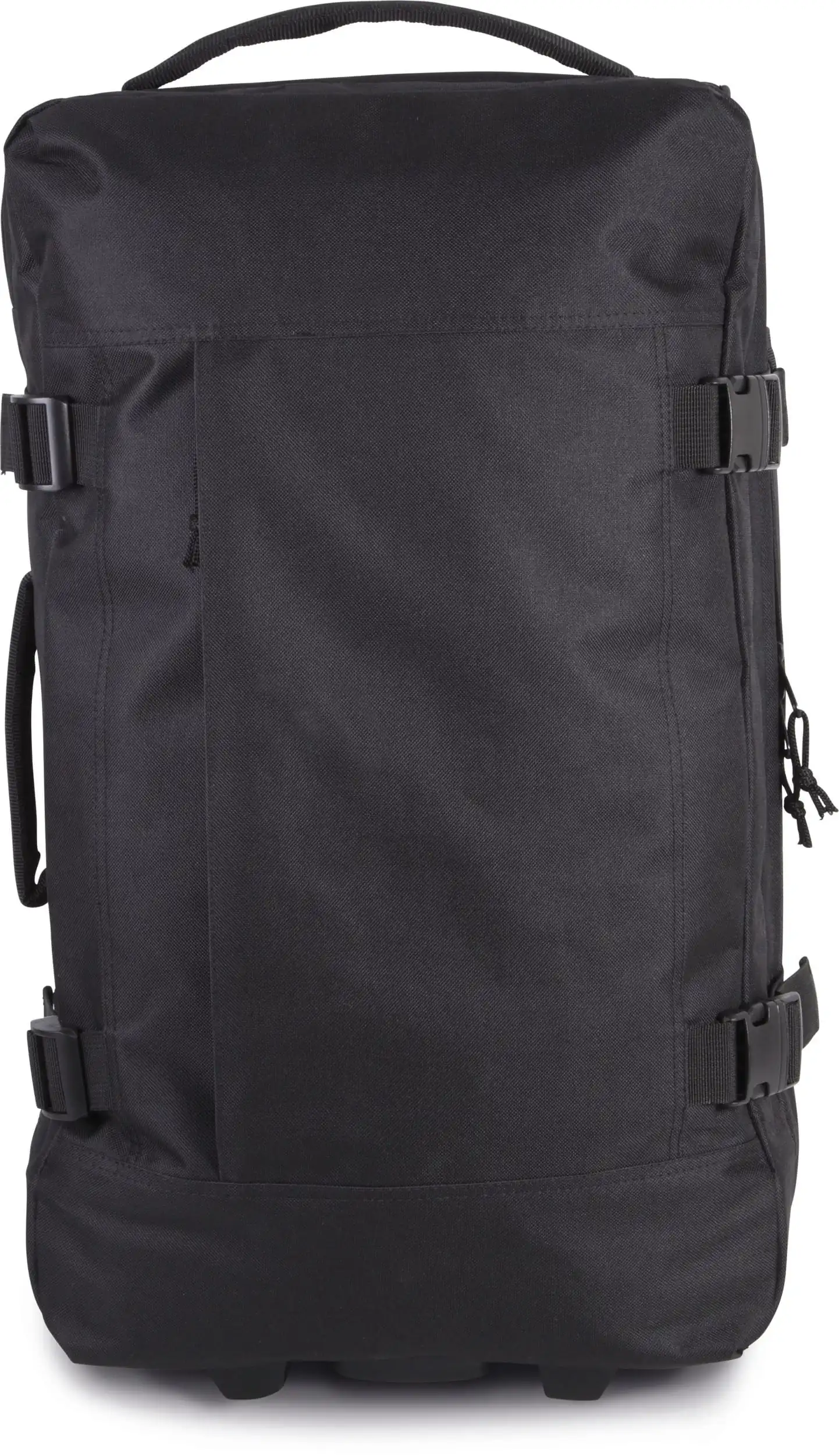Cabine-trolley van 600D polyester met een grote ritszak aan de voorkant voor eenvoudige personalisatie. Binnenin twee vakken met riemen. Intrekbaar trolleysysteem. Aansnoerriemen aan de buitenkant om het volume aan te passen. Onderzijde met versteviging in reliëf en stoppunten op de handgrepen.