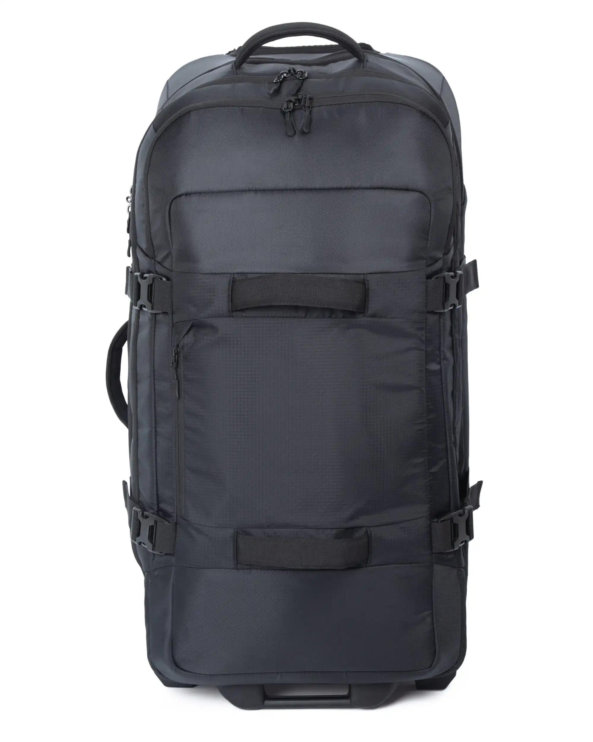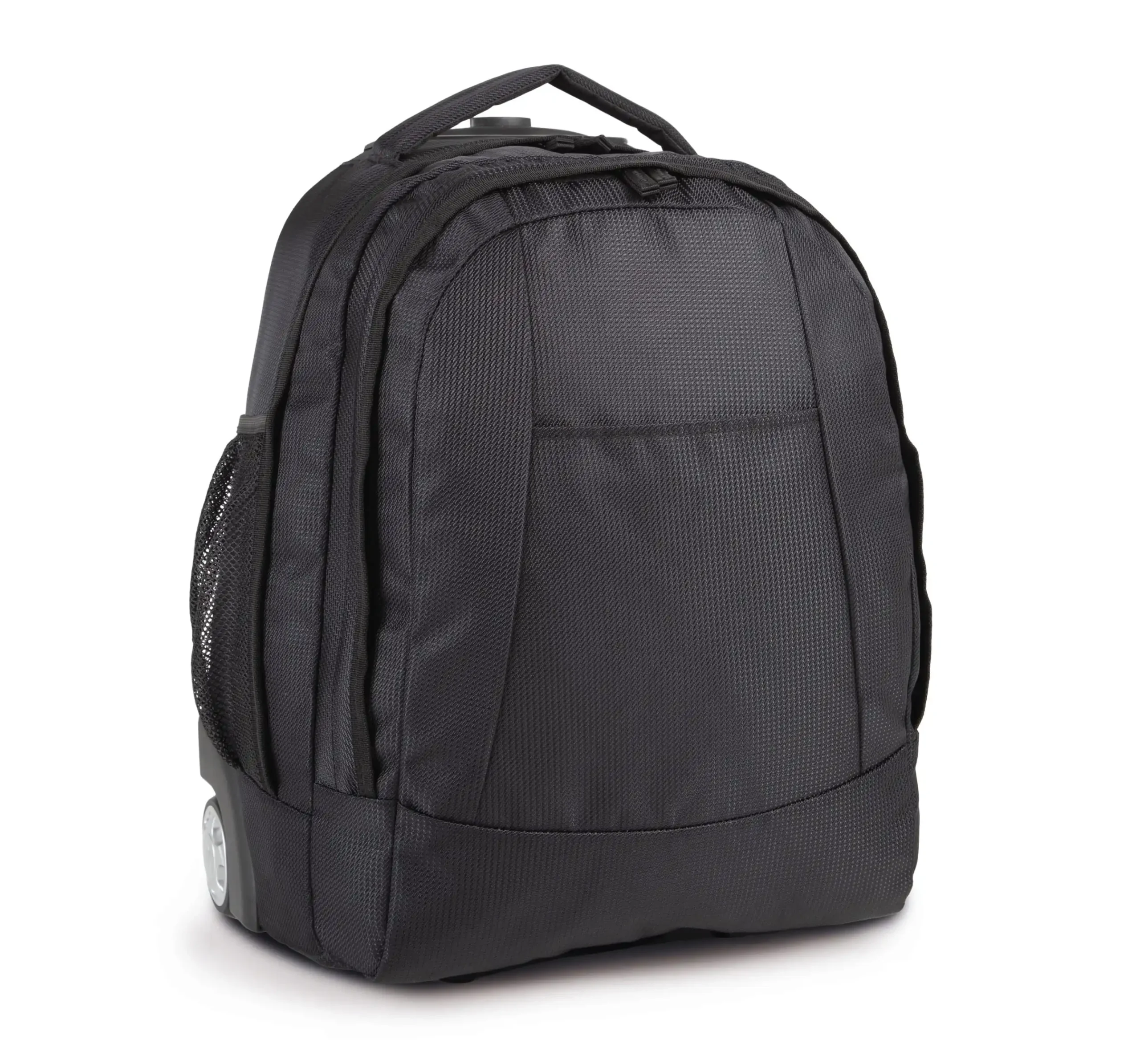 100 % polyester. Trolley geschikt als handbagage. Afneembaar voorpaneel voor eenvoudig bedrukken of borduren. Twee aparte binnenvakken. Versterkte rubberen handgrepen.