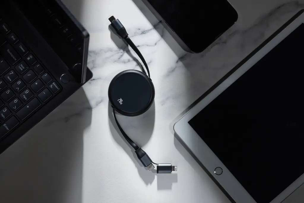 De Chargevix RCS multifunctionele intrekbare oplaadkabelset biedt veelzijdig opladen en gegevensoverdracht voor meerdere apparaten in een compact en georganiseerd ontwerp.De matte zwarte behuizing met transparant deksel bevat een intrekbare kabel van 80 cm en bevat connectors voor USB-C, USB-A, Micro en Lightning, met ondersteuning voor datasynchronisatie en CarPlay en Android Auto.Power delivery is geoptimaliseerd met 60W via USB-C naar USB-C—geschikt zelfs voor het opladen van laptops—en 12W voor USB-A naar USB-C, USB-C naar Lightning en USB-C naar Micro aansluitingen.Bijkomende functies zijn een SIM-kaartverwijderingspen, geheugenkaartslot, SIM-kaartsleuf, telefoonhouder en een Apple Watch-oplader.Gemaakt van RCS-gecertificeerd gerecycled materiaal.RCS (Recycled Claim Standard) is een standaard om het gerecyclede gehalte van een product te verifiëren door de hele toeleveringsketen heen.Totaal gerecycled materiaal: 51% op basis van het totale productgewicht. PVC vrij.
