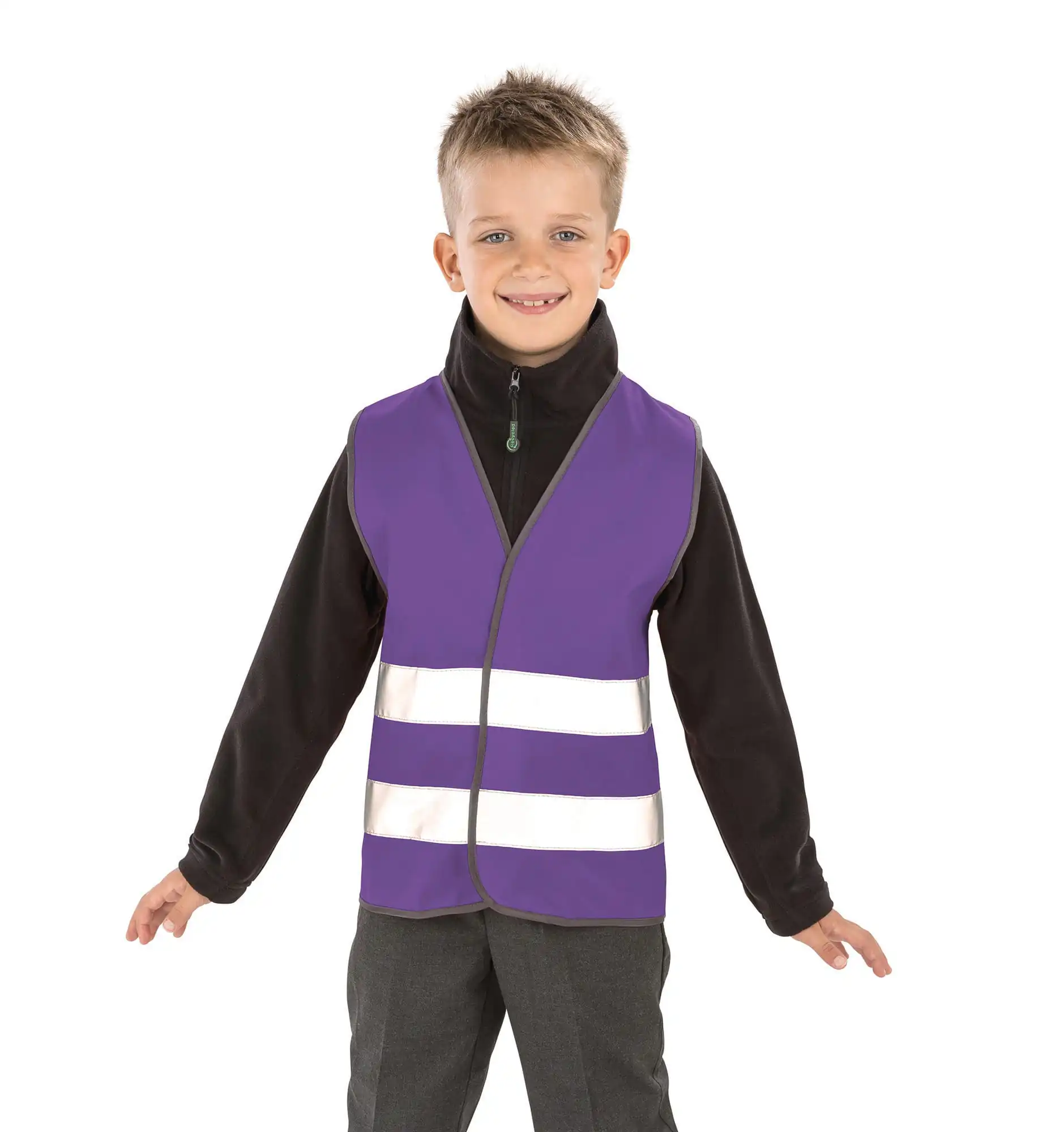 100% polyester. Ruime maatvoering. Afgewerkt met grijze polyester zomen. Genaaide reflecterende stroken (50mm). Voldoet aan EN1150 normering.