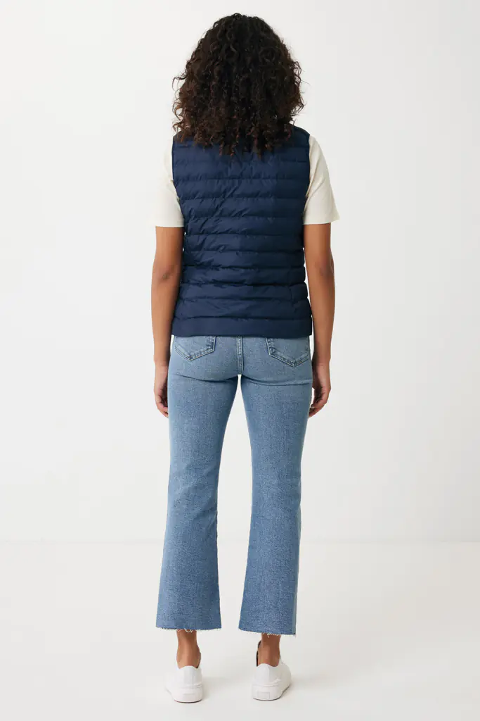 Deze dames bodywarmer bedrukken uitvoering heeft een medium fit en is volledig gemaakt van gerecycled polyester. Zowel de buitenstof als de vulling bestaan uit 100% gerecycled materiaal. Daardoor is de bodywarmer licht van gewicht, maar biedt hij toch prettige warmte.