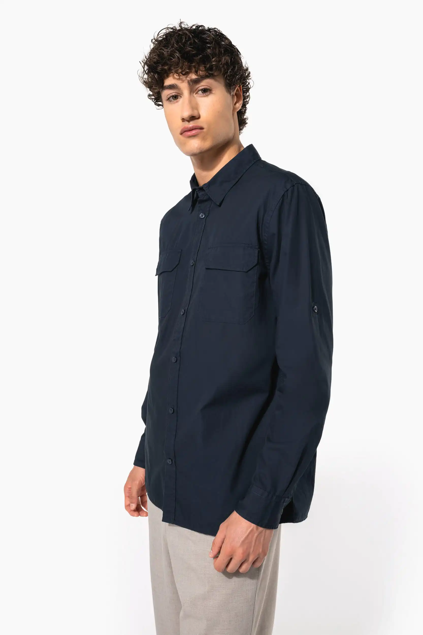 100% katoen. Popeline. Kraag zonder knopen. 2 opgezette zakken met klep aan de voorkant. Verstelbare mouwuiteinden met knoop. Opstroopbare mouwen met een knooplijst. Shirt gewassen. Dit product kreeg een speciale behandeling om het er verouderd te laten uitzien. Dit ambachtelijke procedé maakt dat er kleurverschillen zijn tussen de producten, waardoor elk stuk uniek is.