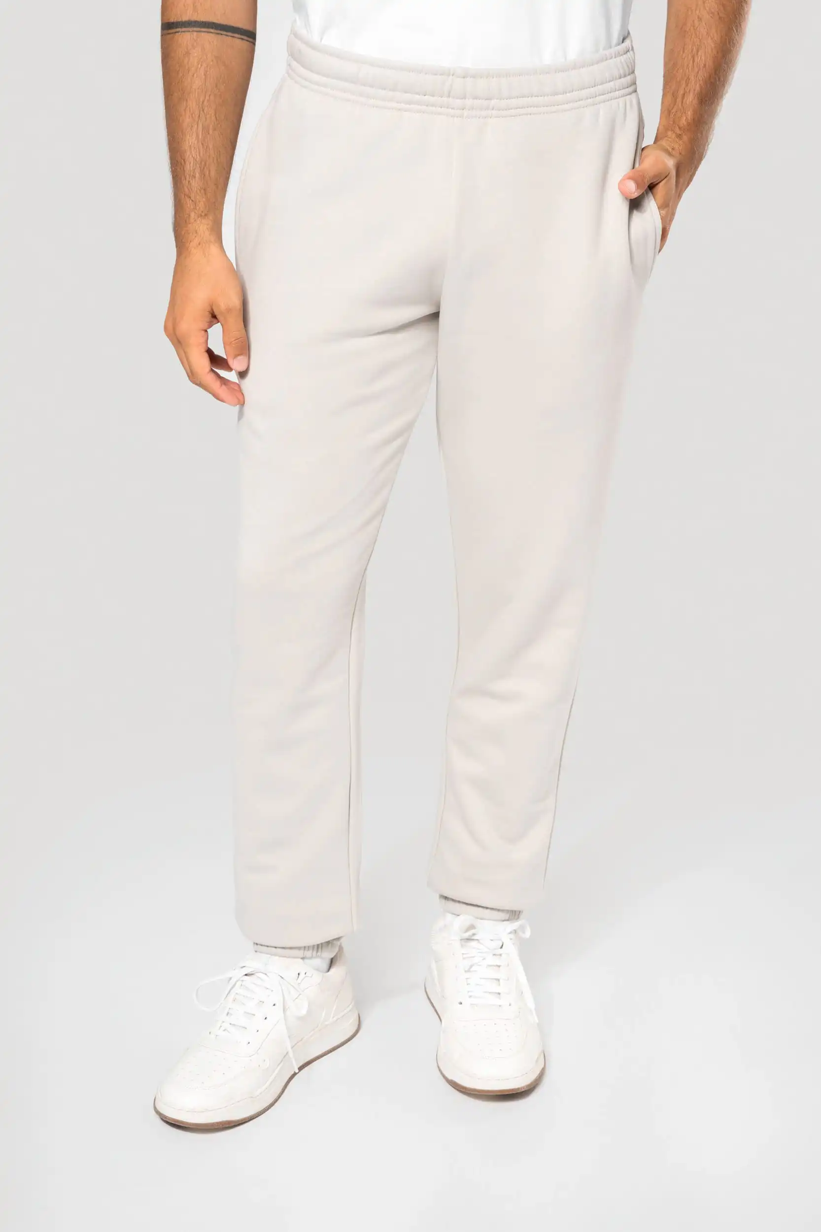 85% katoen / 15% polyester. Gemaakt van 85% biologisch katoen en 15% gerecycleerd polyester post-consumer. Aan de binnenkant geborsteld fleece 3 draden LSF (Low Shrinkage Fleece). Enzymgewassen. Rechte snit. 2 Italiaanse zijzakken. Elastische tailleband met platte aanrijgkoordjes. Dubbel stiksel aan de onderkant van het kledingstuk. Geen merklabel, maar enkel een maatlabel voor eenvoudige personalisatie.