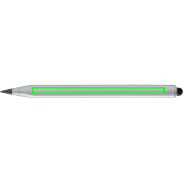 Moderne oneindigheidspen gemaakt van RCS-gecertificeerd gerecycled aluminium. Totaal gerecycled materiaal: 40% op basis van het totale gewicht van het artikel. RCS-certificering zorgt voor een volledig gecertificeerde toeleveringsketen van de gerecyclede materialen. Driehoekig gevormd model met n zijde met CM-aanduiding en n zijde met inches. Traditionele houten potloden schrijven slechts tot ongeveer 200 meter, maar deze boomvrije oneindigheidspen heeft een schrijflengte van tot wel 20000 meter met een grafietpunt om een grafietlijn te produceren. Niet alleen schrijft het als een potlood, maar de markeringen kunnen ook worden uitgegumd. Het werkt door een grafietlijn op papier achter te laten, net als een regulier traditioneel houten potlood, maar het slijt zo langzaam dat het tot wel 100 traditionele houten potloden zou kunnen overleven! Met een touchtip om een mobiel apparaat te bedienen. Verpakt in FSC mix-verpakki””