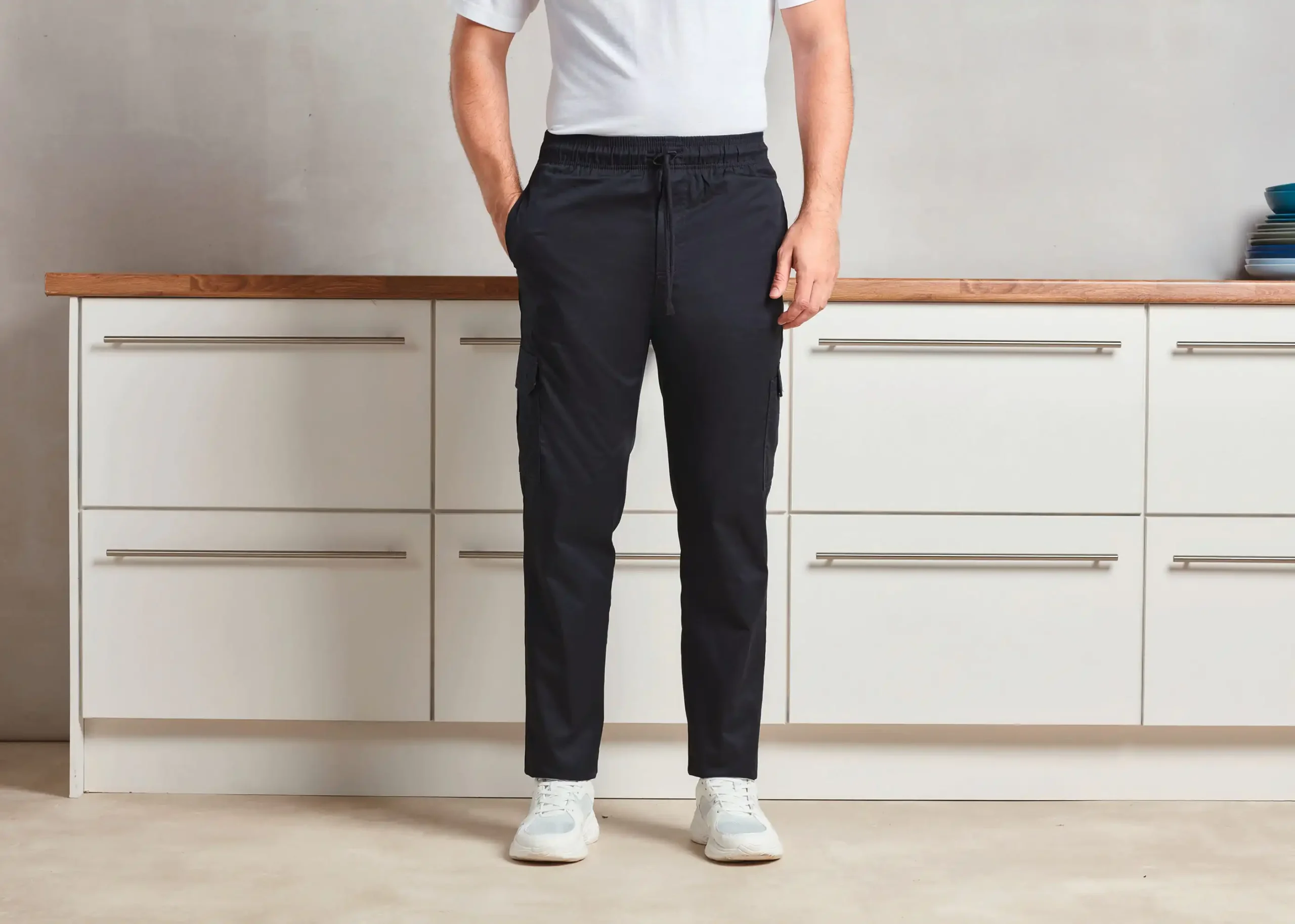 65% polyester / 35% katoen twill. Eenvoudig aan te trekken dankzij een elastische tailleband met aanrijgkoordjes. Zijzakken. Unisex model. Beenlengte binnenkant: 77cm. Industrieel reinigen tot 85°C. Huiselijk reingigen tot 60°C.