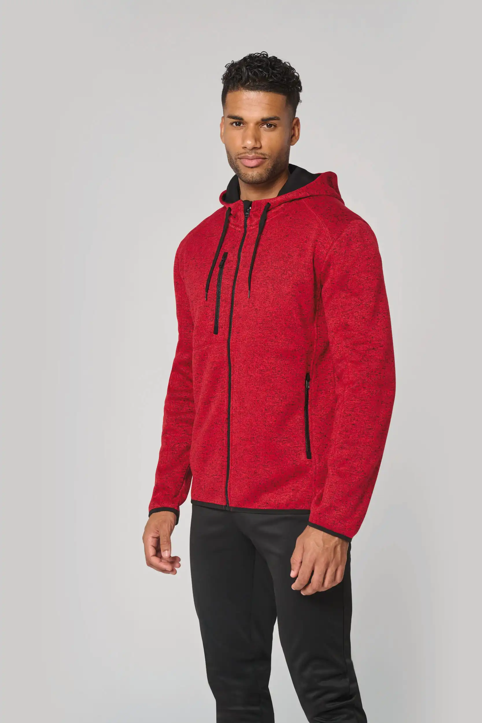 Geborstelde binnentricot 100% polyester. 2 contrasterende ritszakken aan de voorkant en 1 contrasterende borstzak met rits. Capuchon met contrasterende jerseyvoering van 100% katoen met platte, contrasterende aanrijgkoordjes. Mouwuiteinden en onderkant kledingstuk, afgewerkt met contrasterende, elastische biaisband. Overlocksteek op de inzetstukken.