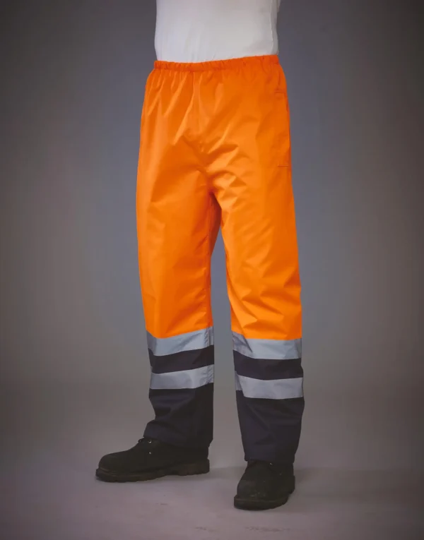 100% polyester. Oxford PU coating. Waterdicht. Twee 5 cm brede reflectiebanden rond de onderbenen. Elastische tailleband. Drukknopen onderaan voor het aanpassen van de pasvorm. Doorstikte en gesealde zomen voor een perfecte waterdichtheid. Conform aan EN ISO20471:2013 Klasse 1 & EN343 tegen barre weersomstandigheden: enkel Hi Vis Yellow, Hi Vis Yellow/Navy, Hi Vis Orange et Hi Vis Orange/Navy. Hi Vis Orange en Hi Vis Orange/Navy ook conform aan GO/RT 3279.
