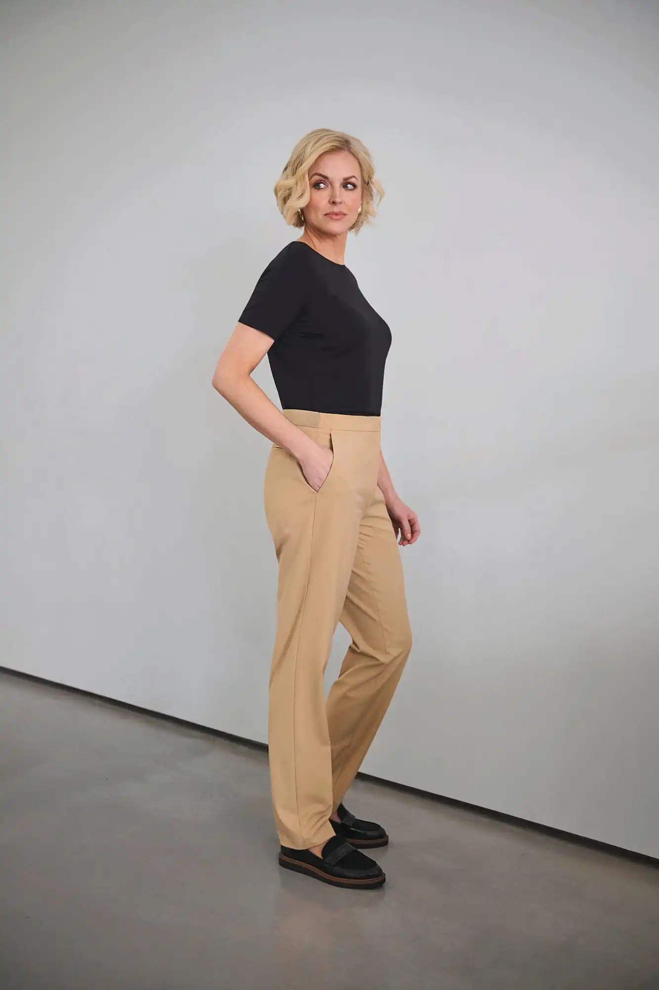67% polyester (gerecycled), 28% viscose, 5% lycra. Slim fit, 5-knoops voorkant, gevoerde achterkant met verstelmogelijkheden, 2 smalle paspelzakken.