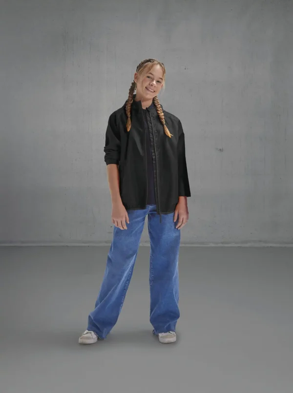 100% gerecycled polyester. Waterafstotend dankzij de DWR-coating (Durable Water Repellent). Uniseks, geschikt voor verschillende leeftijden. Raglanmouwen, capuchon met veiligheidselastiek en elastische onderzoom. Semi-elastische boorden. 2 voorzakken met rits.