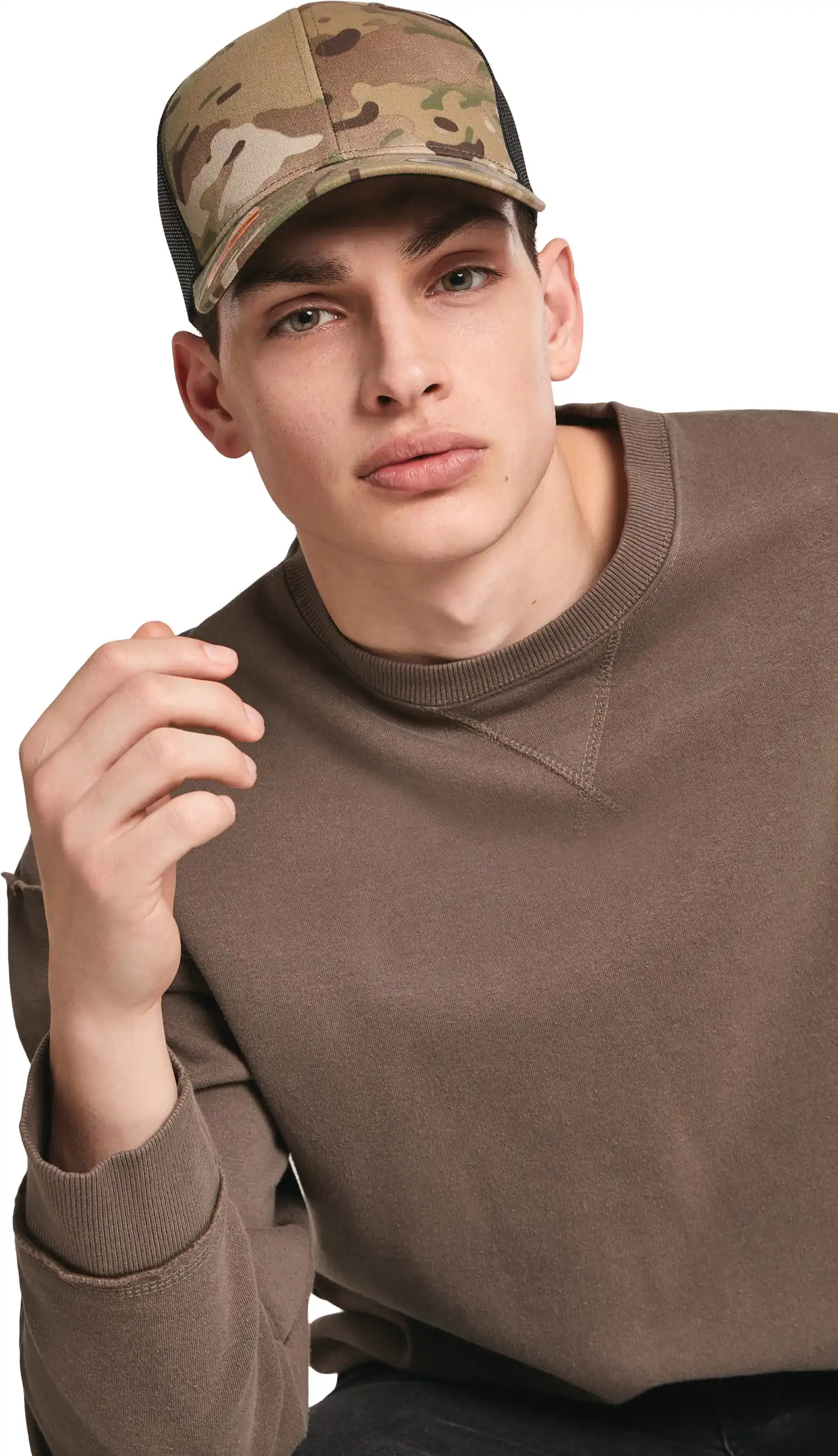 60% katoen, 40% polyester (mesh: 100% polyester). Platte vorm, voorste deel met een versterkt canvas, middennaad en snapback-stijl.