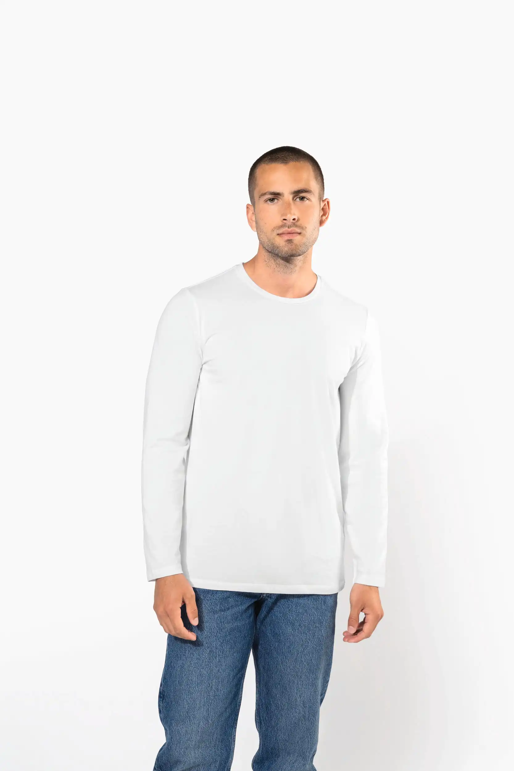 97% katoen / 3% elasthan. Chiné kleuren: 87% katoen / 9% viscose / 4% elasthan. Ronde hals. Dubbel stiksel aan mouwuiteinden en onderkant. De moderne getailleerde snit zijn volgens de laatste modetrends.