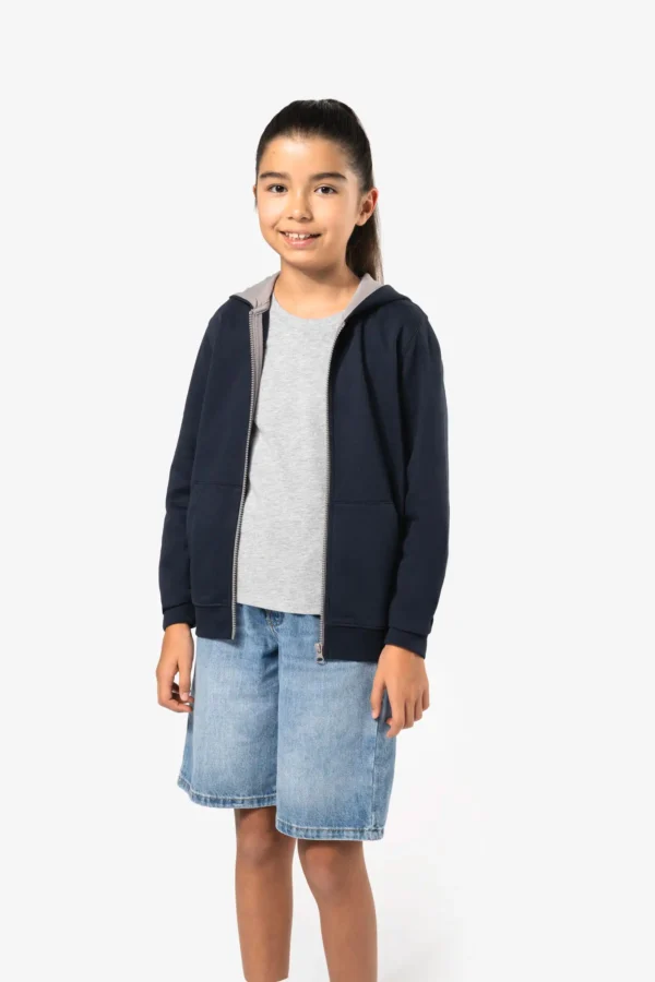 80% gekamd katoen / 20% polyester (Oxford Grey: 76% gekamd katoen / 21% polyester / 3% viscose). Geborsteld fleece aan de binnenkant. Ribboord aan mouwuiteinden en onderkant kledingstuk. Gevoerde capuchon in contrasterende kleur. Contrasterende rits. Opening voor headset-snoer in de kangoeroezak en halsopening.