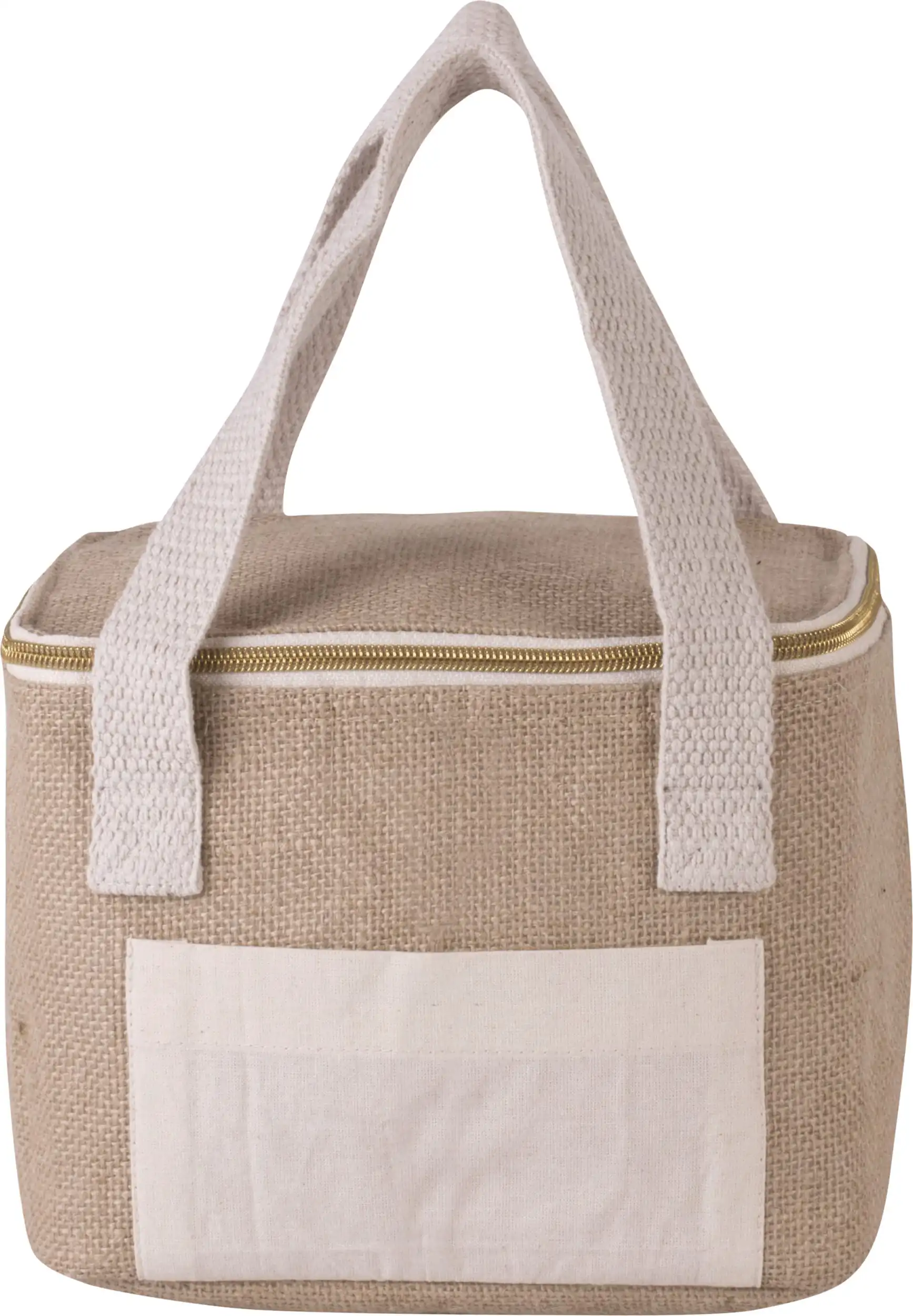 Koeltas met buitenzijde van jutecanvas en katoenen zak voor eenvoudige personalisatie, koelvak binnenin met isolerende wand van aluminium en koelschuim met hoge densiteit. Katoenen hengsels. Middelgroot model.