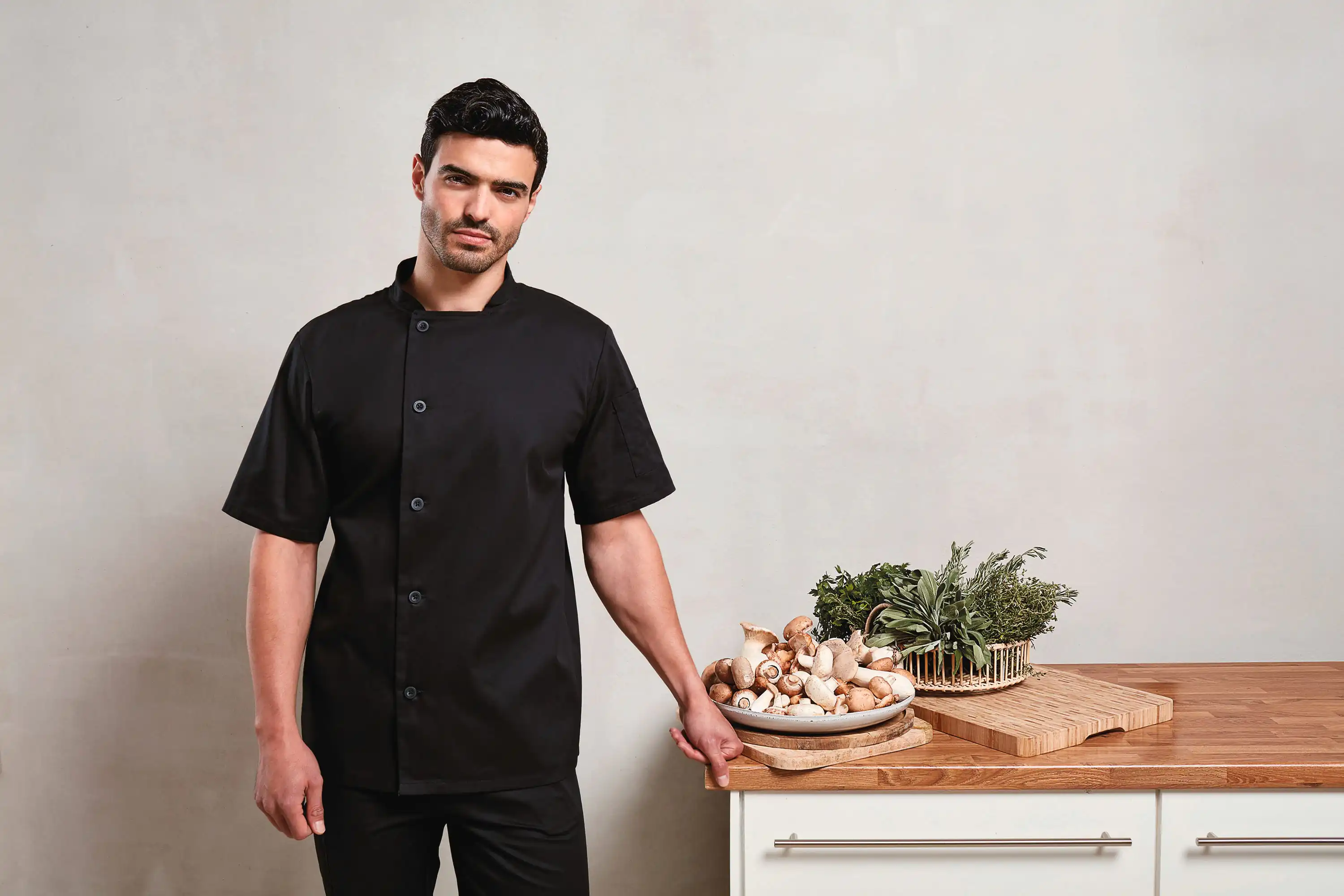 65% polyester / 35% twillkatoen. Sluit met vijf knopen van superieur hars. Zak voor twee pennen op de linkermouw. Maokraag. Industrieel wassen op 85 °C. Thuis wassen op 60 °C.