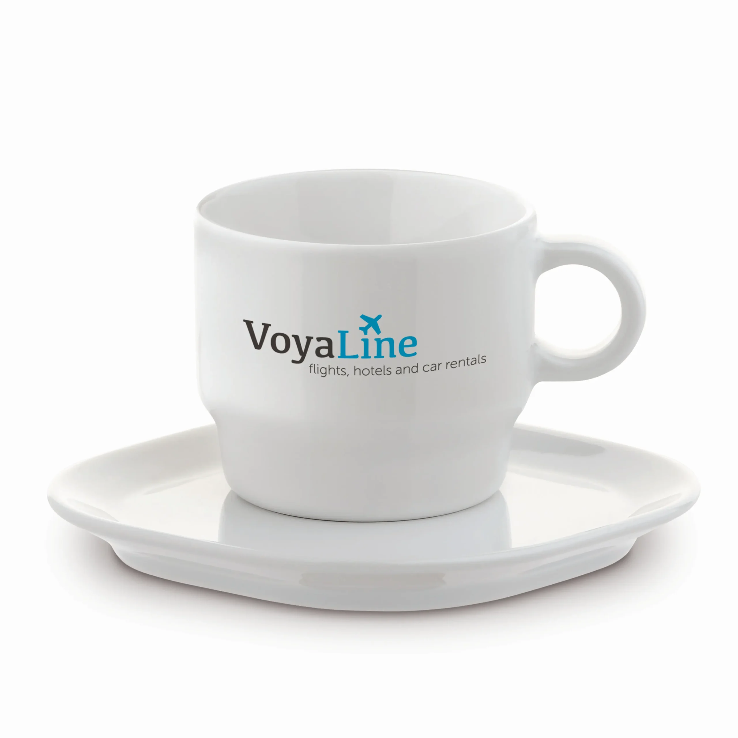 Kop en schotel van hoogwaardig porselein uit de ‘Satellite’ serie. Kop is stapelbaar en biedt een groot bedrukkingsoppervlakte. Het vierkante schoteltje bied extra ruimte rondom het kopje. Geproduceerd in Europa.