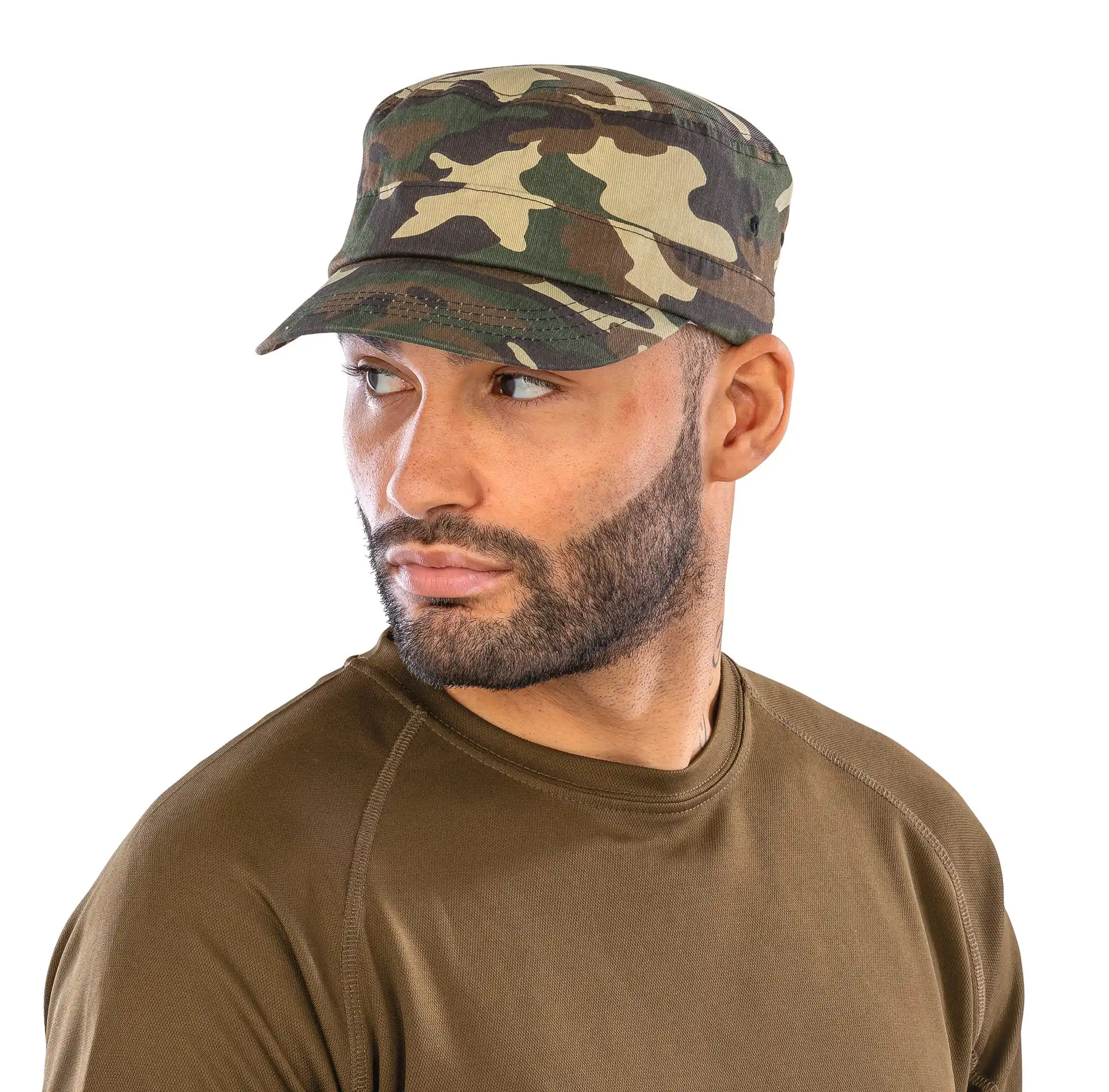 100% polyester. 5 panelen. Lang profiel en afgeronde klep. Aanpasbaar met aanrijgkoordjes achteraan. Geen middennaden, voor eenvoudige bedrukking. Nek en oor bescherming.Geschikt voor borduring.