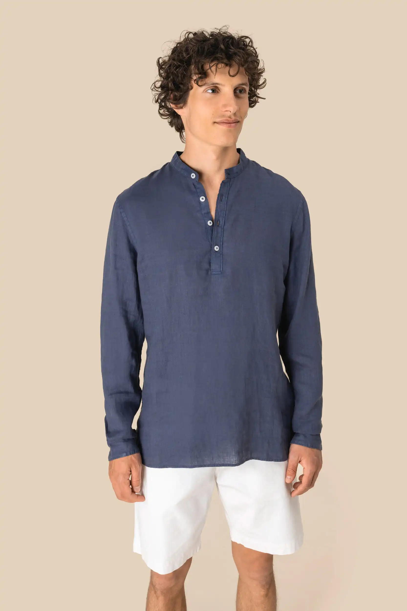 100 % Linnen. Geweven. Afgewassen blouse. Rechte snit. Klassieke knooplijst met knopen met parelmoereffect. Borstzak aan de linkerkant Inzetsel op de rug met plooi voor meer bewegingsvrijheid. Knopen op de polsband met verstelbaar uiteinde. Contrasterend Natural biesje aan de binnenkant van de kraagstaander. De kleur Linen werd niet geverfd en kan variëren van product tot product.