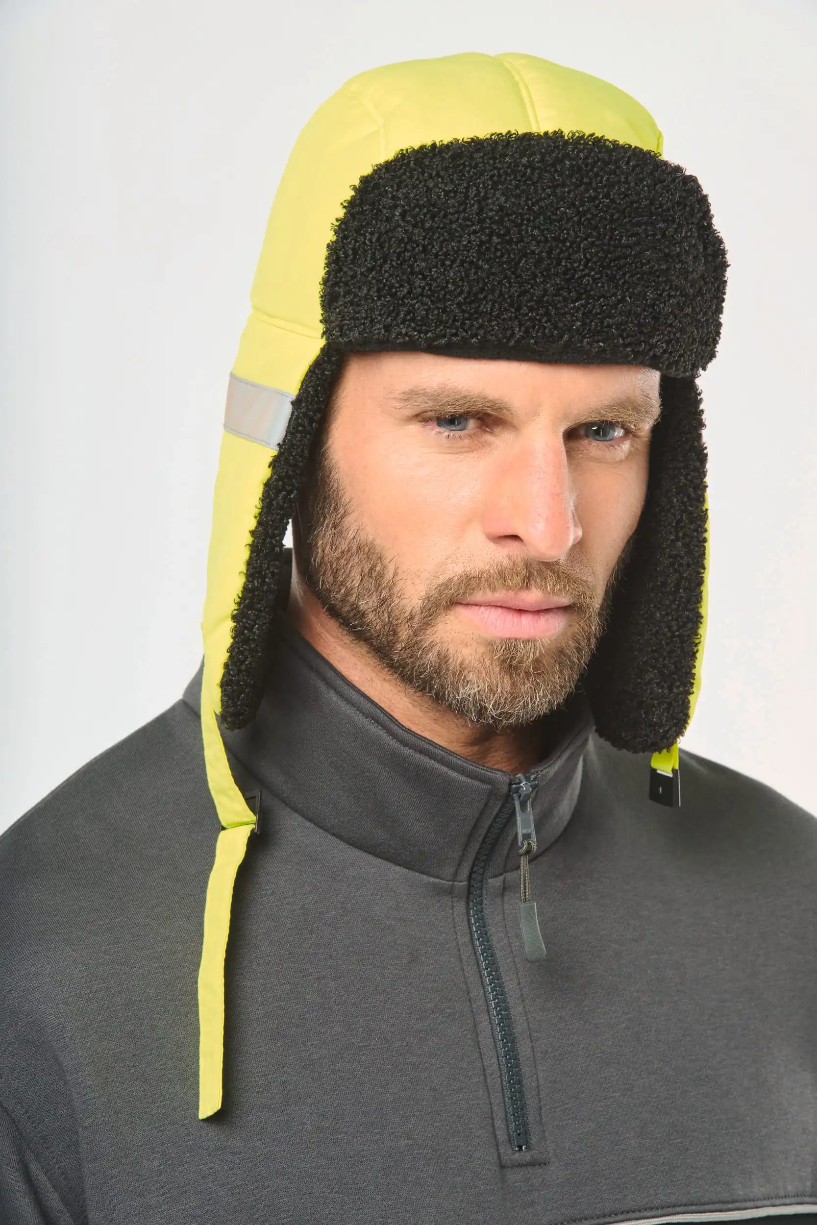 65% polyester / 35% katoen. Polykatoenen twill-stof. Wassen op 60°C. Verstelbaar met linten aan de achterkant. Ruimtesplit achteraan. Voorste binnenband van badstof, voor een optimaal comfort.