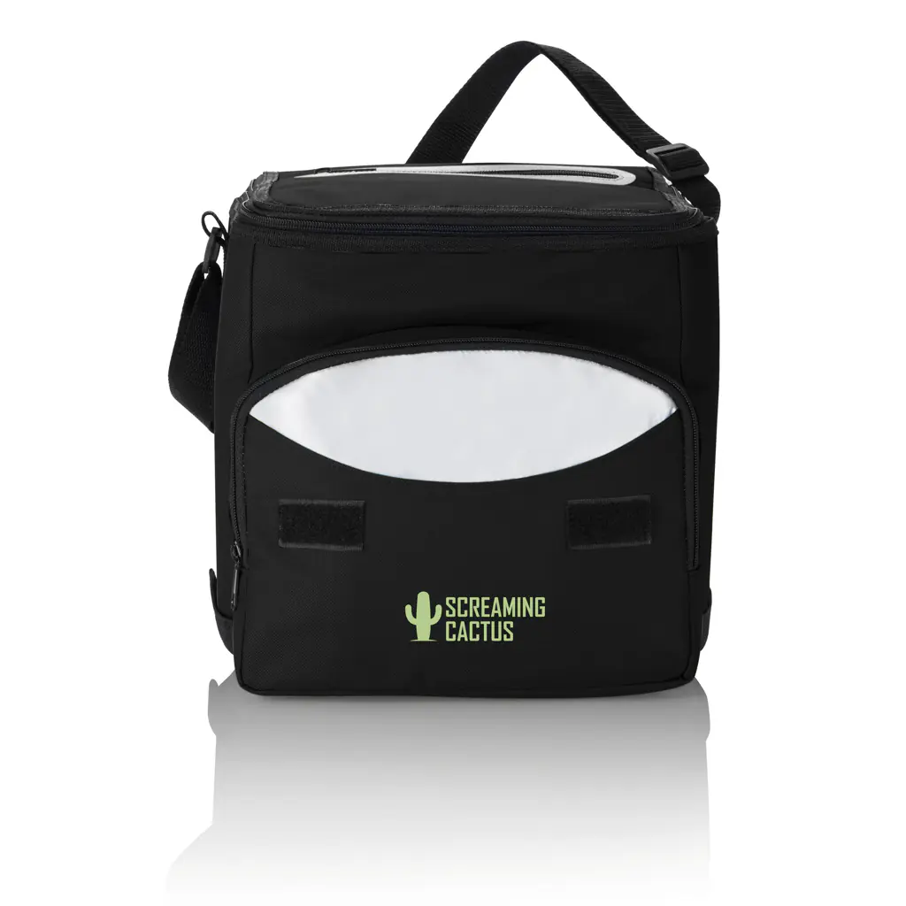 600D koeltas met zilverkleurige voering voor langdurige koeling van uw dranken en etenswaren. Extra voorvak met kleuraccent rondom de ritssluiting om uw overige spullen in op te bergen.