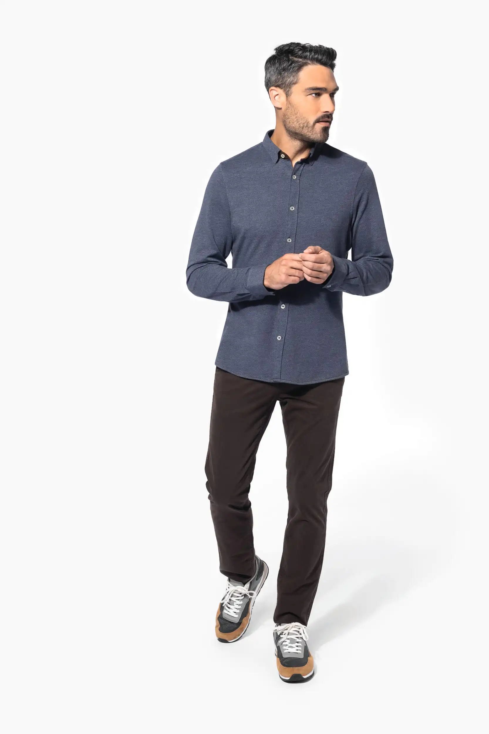 100% gekamd katoen piqué (Oxford Grey: 90% katoen / 10% viscose). Soepele en comfortabele stof. Klassieke knooplijst met toon-op-toon knopen. Regelbare manchetten met toon-op-toon knopen. Afgeronde boord aan de onderkant.