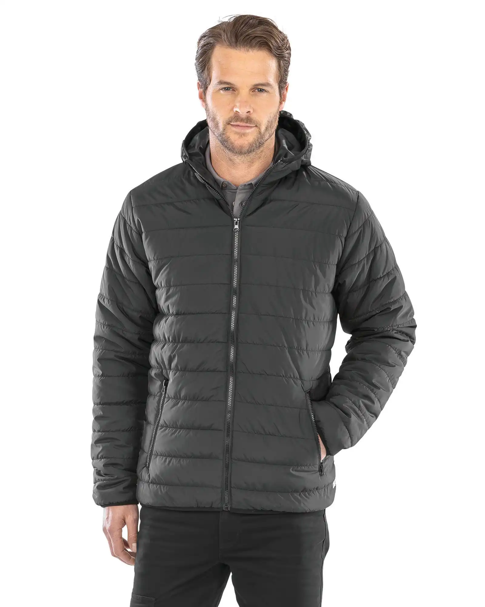 100% polyester, winddicht en waterafstotend. Zeer zacht, licht en warm. Binnenvoering, contrasterende afwerkingen en ritssluiting. Biesje aan mouw- en jasboorden. Reflecterende stroken aan de zijkant. Capuchon in het verlengde van de kraag. Ritszakken. Ophanglus. Eenvoudig op te bergen en compact. Drukkersrits.