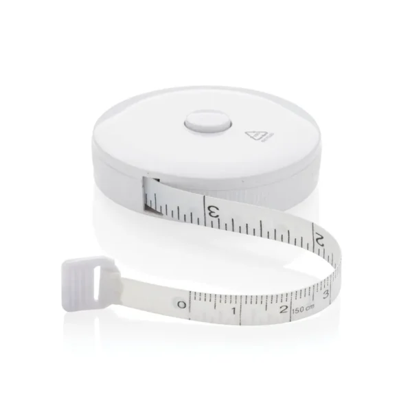 1,5 m/60 inch gerecycled plastic meetlint met terugduwknop, geschikt voor voor fitness en mode. De behuizing is gemaakt van RCS-gecertificeerd gerecycled ABS-plastic en glasvezel. Totale gerecyclede inhoud: 64% op basis van het totale gewicht van het artikel. RCS-certificering zorgt voor een volledig gecertificeerde toeleveringsketen van de gerecyclede materialen. Het lint is 8 mm breed en intrekbaar door middel van een knop. Verpakt in FSC® mix-verpakking.