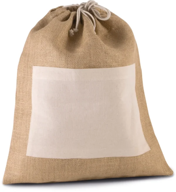 Tas van jutecanvas met koordjes, doorweven met glansdraad in een contrasterende kleur. Katoenen zak op de voorkant voor eenvoudige personalisatie.