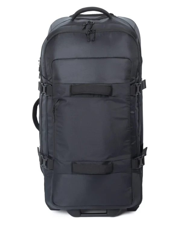 100% polyester. XL-trolley. Dubbel vak met scheidingspaneel met rits om er één groot vak van te maken. Grote zak met dubbele handgreep vooraan. Intrekbaar trolleysysteem. Opzij bagageriemen met grote gespen. Het wieltjessysteem houdt de trolley ook volgeladen stabiel.